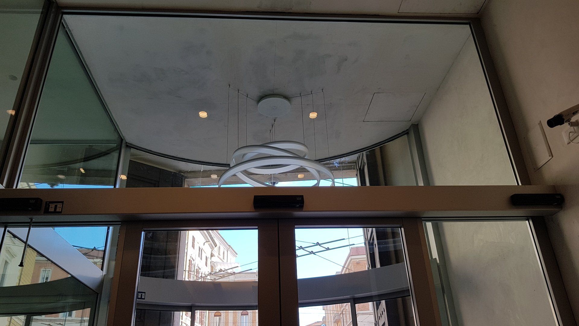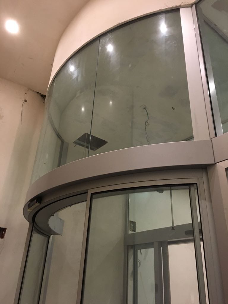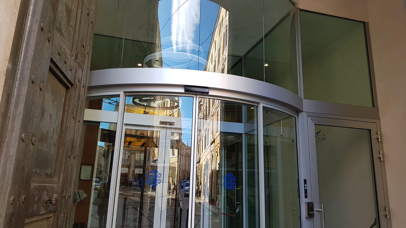La bussola di ingresso automatica, composta da un infisso esterno e uno interno automatico in cristallo stratificato di sicurezza ha una geometria circolare così da assorbire, nel percorso, l’inclinazione di circa 6° tra l’ingresso allo stabile e il percorso interno. Ha uno sviluppo verticale da pavimento a soffitto (4,20 m) ed è realizzata con profili metallici e vetro al fine di permettere il massimo ingresso della luce naturale.