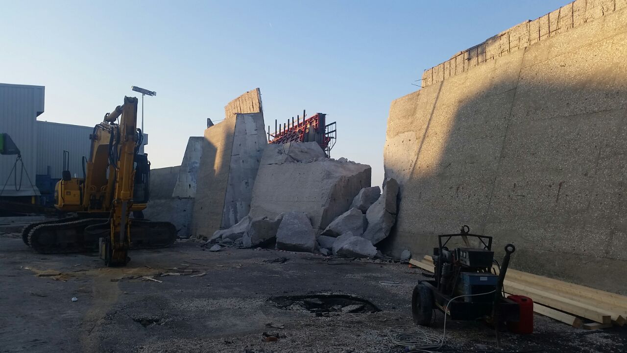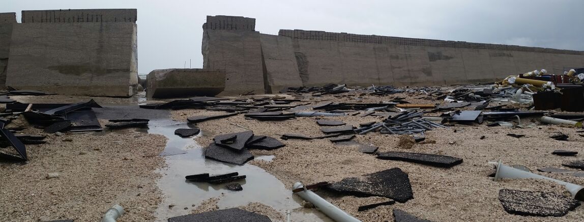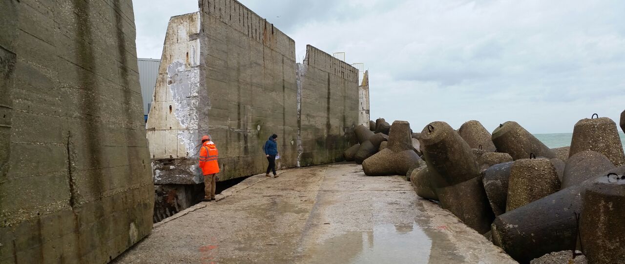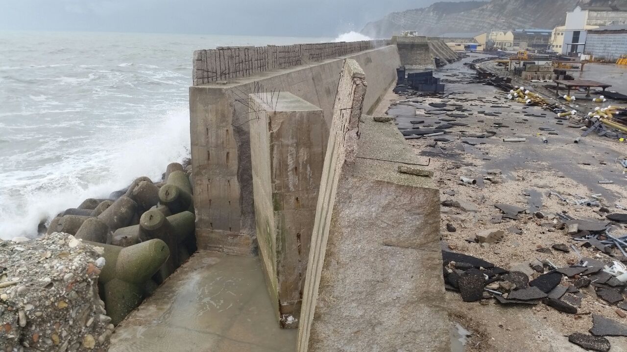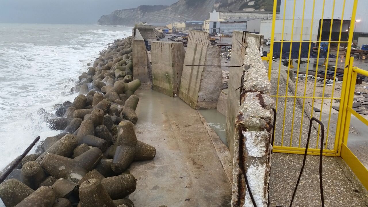 Il muro di difesa delimitante l'area dello Stabilimento sul lato N-E è stato danneggiato in diversi punti, interessando 4 conci, di cui uno spezzato e ribaltato verso l’interno del cantiere. Il primo blocco verso est che è stato spostato risulta essere un concio di lunghezza di circa 5m, il secondo ed il terzo blocco (quello ribaltato) facevano parte di uno concio lungo 10 m che è stato spezzato circa a metà, mentre il terzo ed il quarto blocco sono conci lunghi 10 metri che sono stati ruotati e spostati dalla mareggiata.